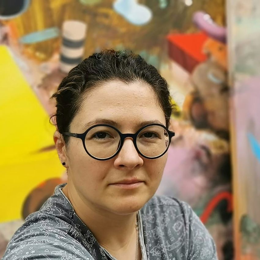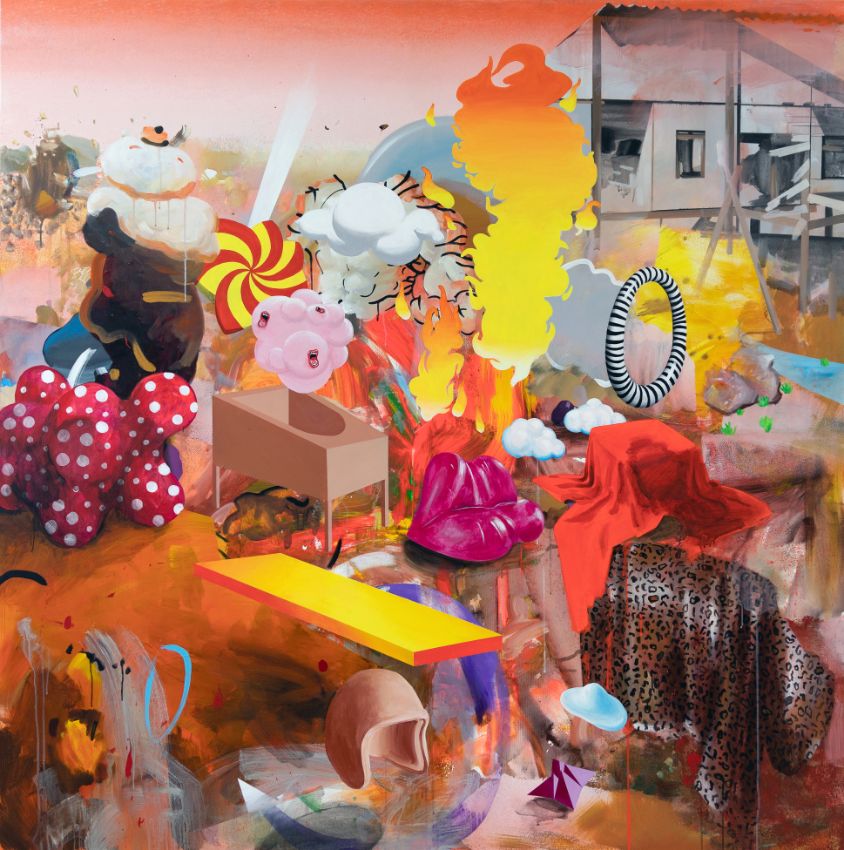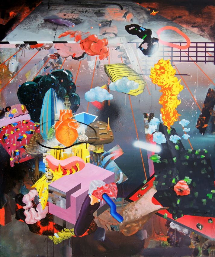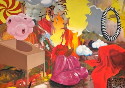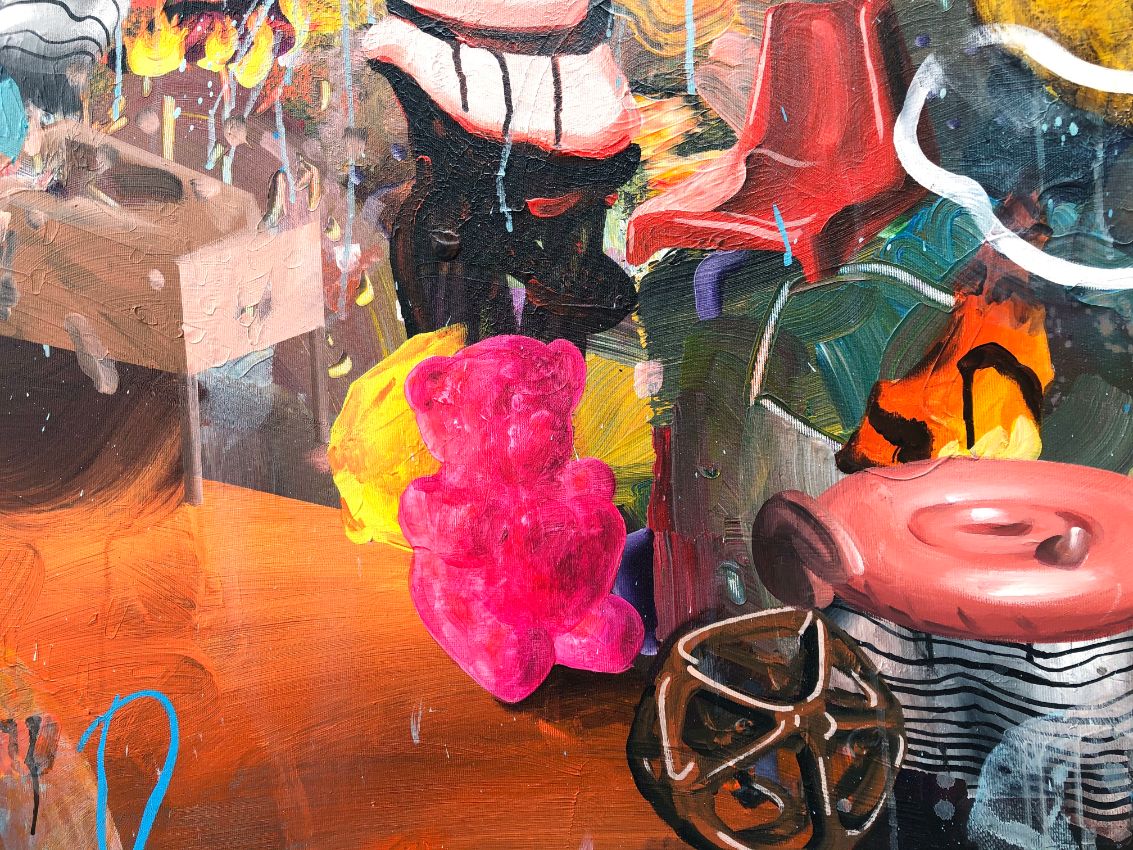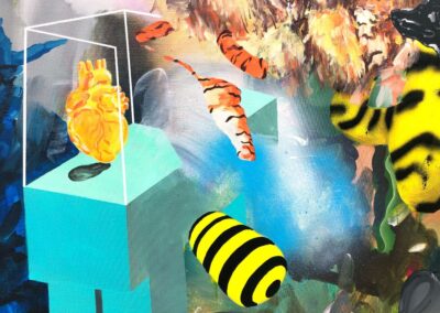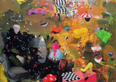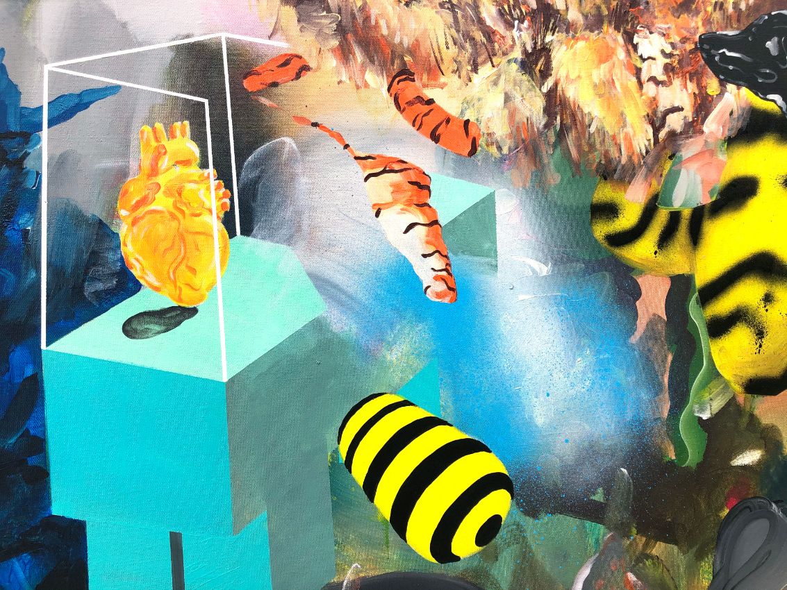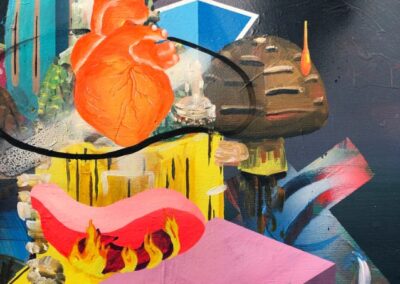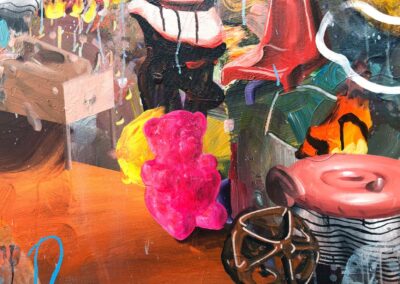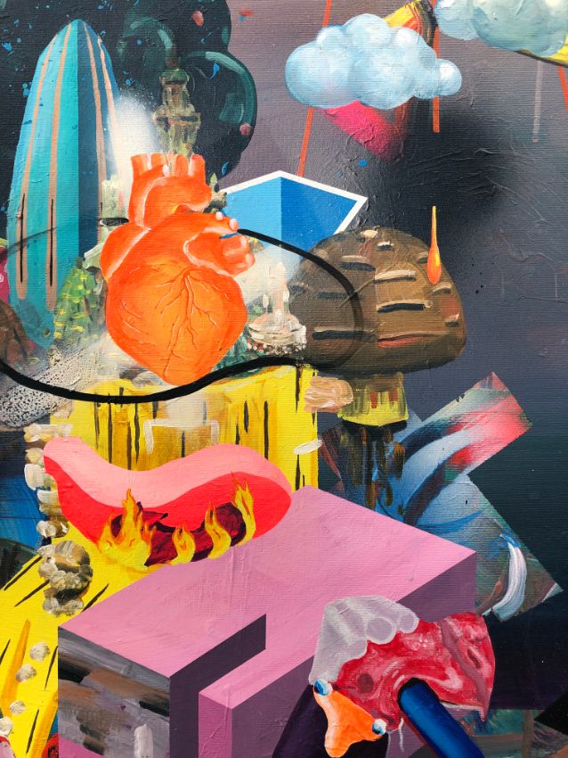 At the crossroads between abstract and figurative, my works are influenced by the changes in my life and in the surroundings where I live which are the underlying image for my art. Starting with the series Junkyard Symphony, my paintings gradually became more of a surrealist journey in the universe of the urban periphery.  The devastating effects of junk invasion and consumerism on our living space is allegorically recomposed in these paintings. All of these reminiscences of our daily waste are caught dancing, floating in their singularity. In more recent series like Personal Mythologies, Hybrid Playground or Synthetic Future, they even start creating their own story. . But in Synthetic Future, I want elements to be more and more concretely shaped and intense in colour, similarly to what we see in the advertisement aesthetic, supermarkets, or product packaging design. It’s an invasion of information and products, so I want my works to look like that, more powerful and disturbing. With an increasing appearance of figurative elements and even insertions of pop art, works like Synthetic Future criticize capitalism, consumerism, waste or pollution, sending a warning sign to the future.